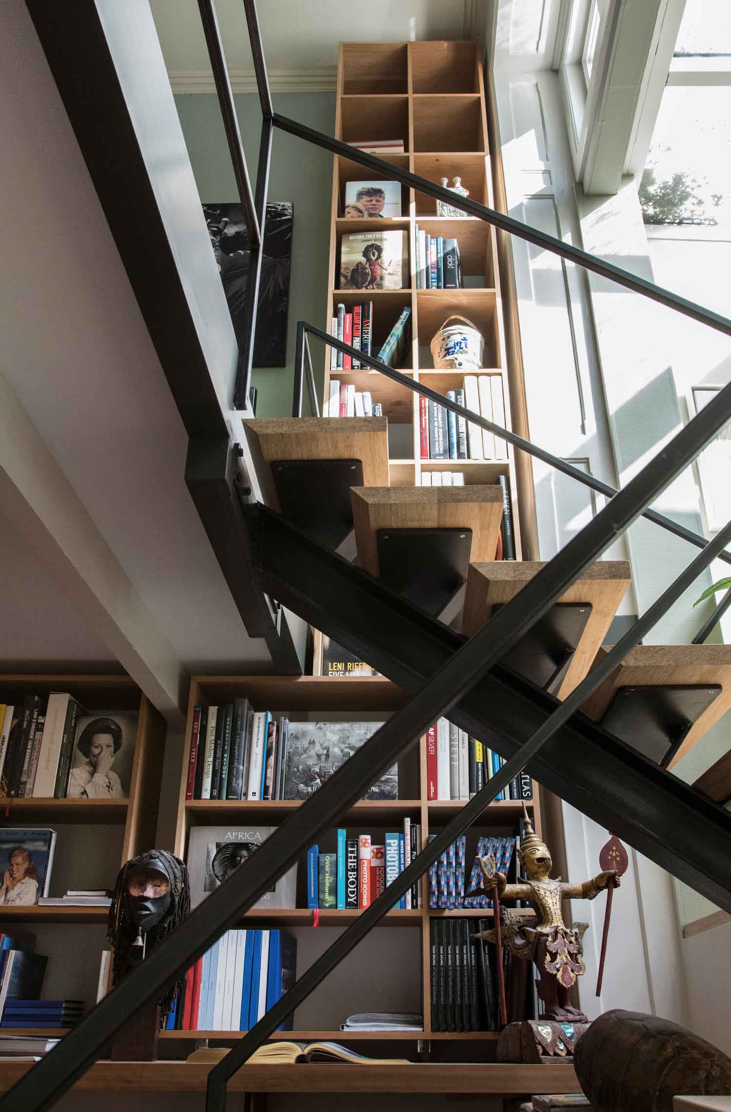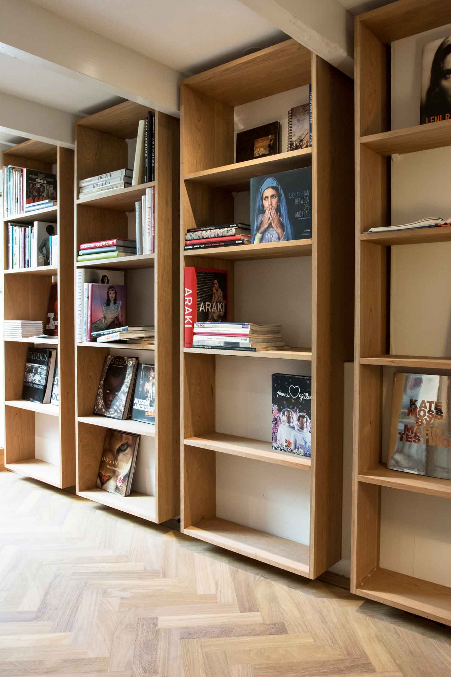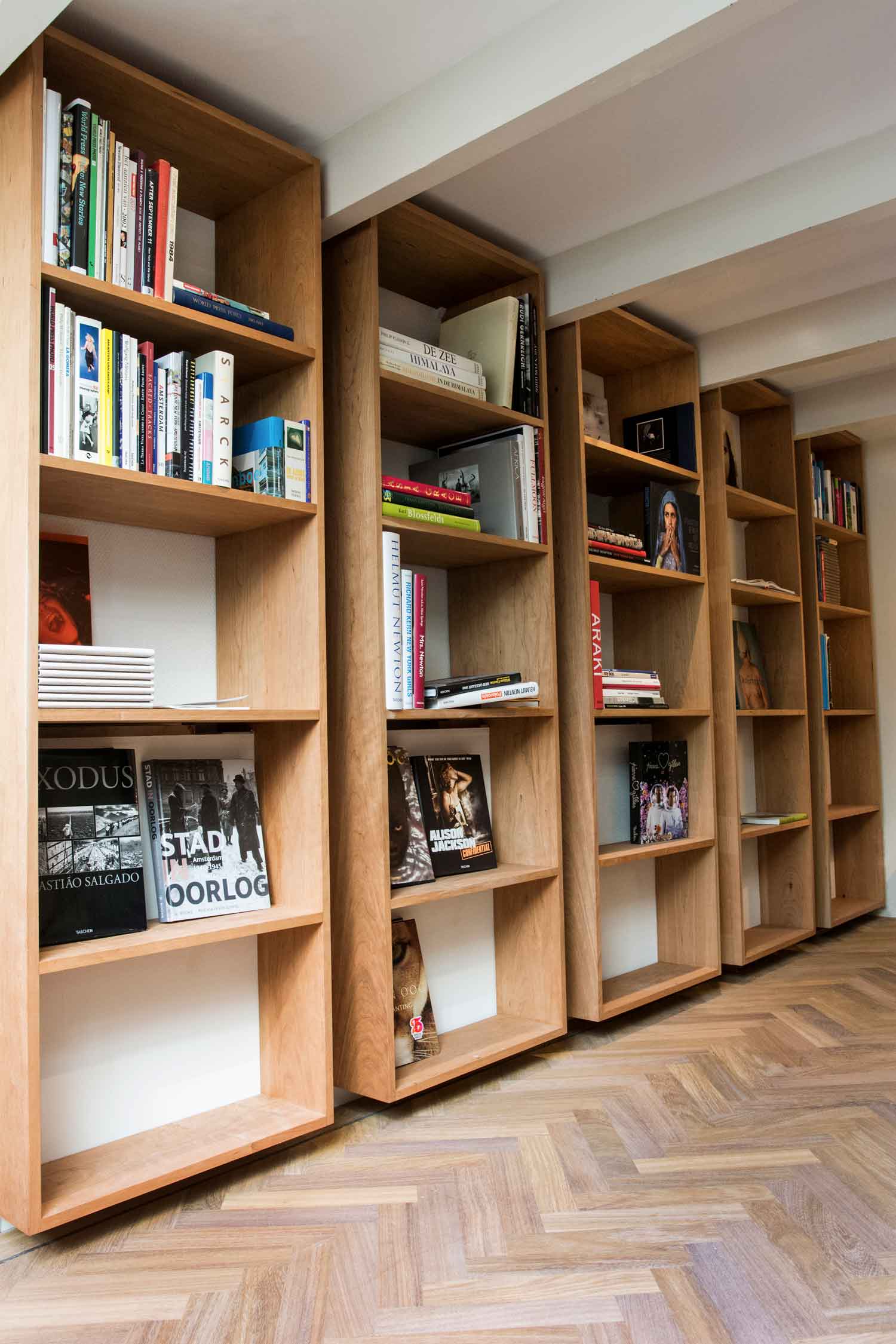 Een ongebruikte souterrain en een enorme hoeveelheid fotoboeken waren de aanzet tot deze uitdaging: een mini bibliotheek. Door de overgangen hard te materialiseren en tegelijkertijd de ‘ruimtes’ met een kast geleidelijk in elkaar te laten grijpen, ontstaat er een prettige spanning zo passend bij de visuele wereld van de fotografie.