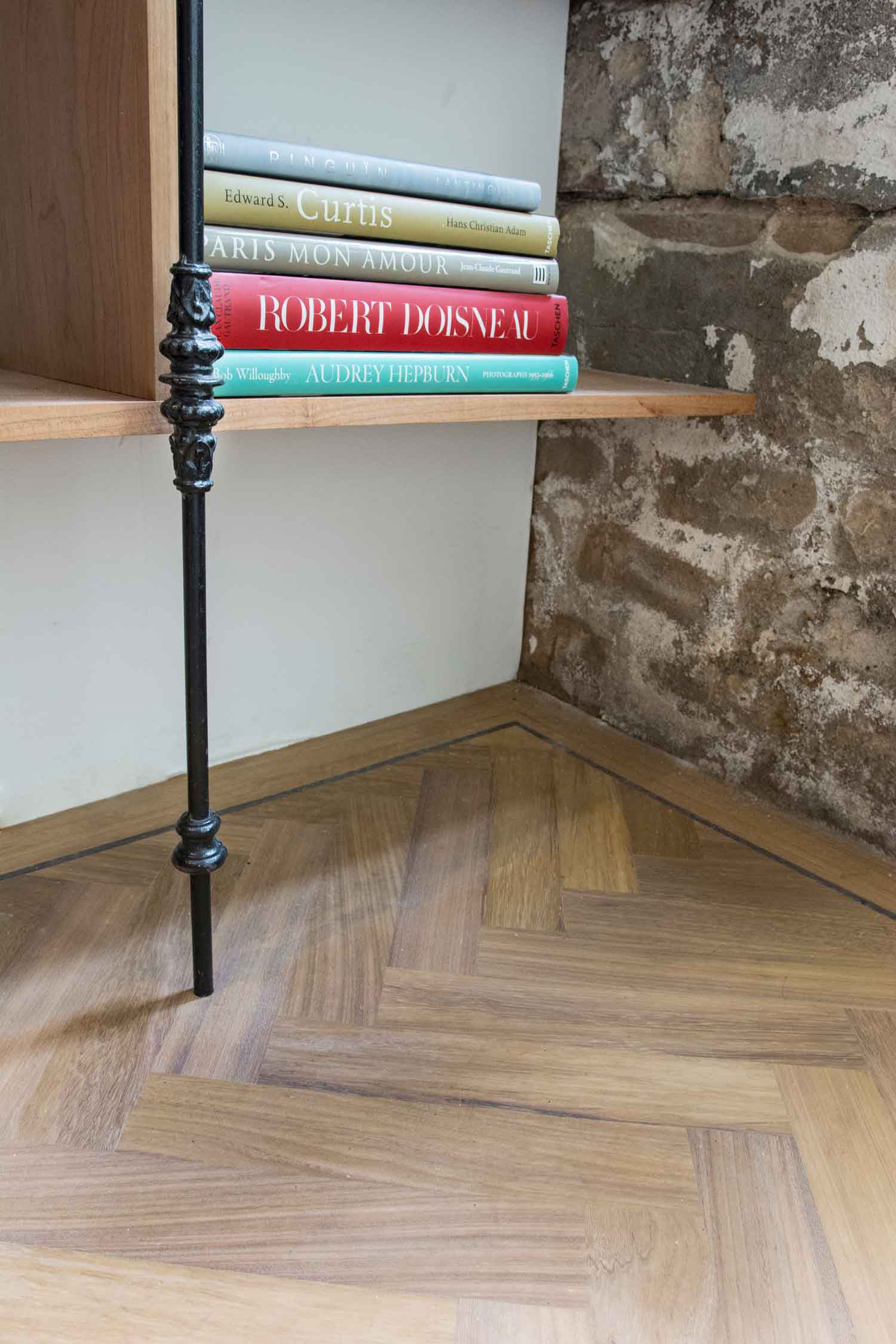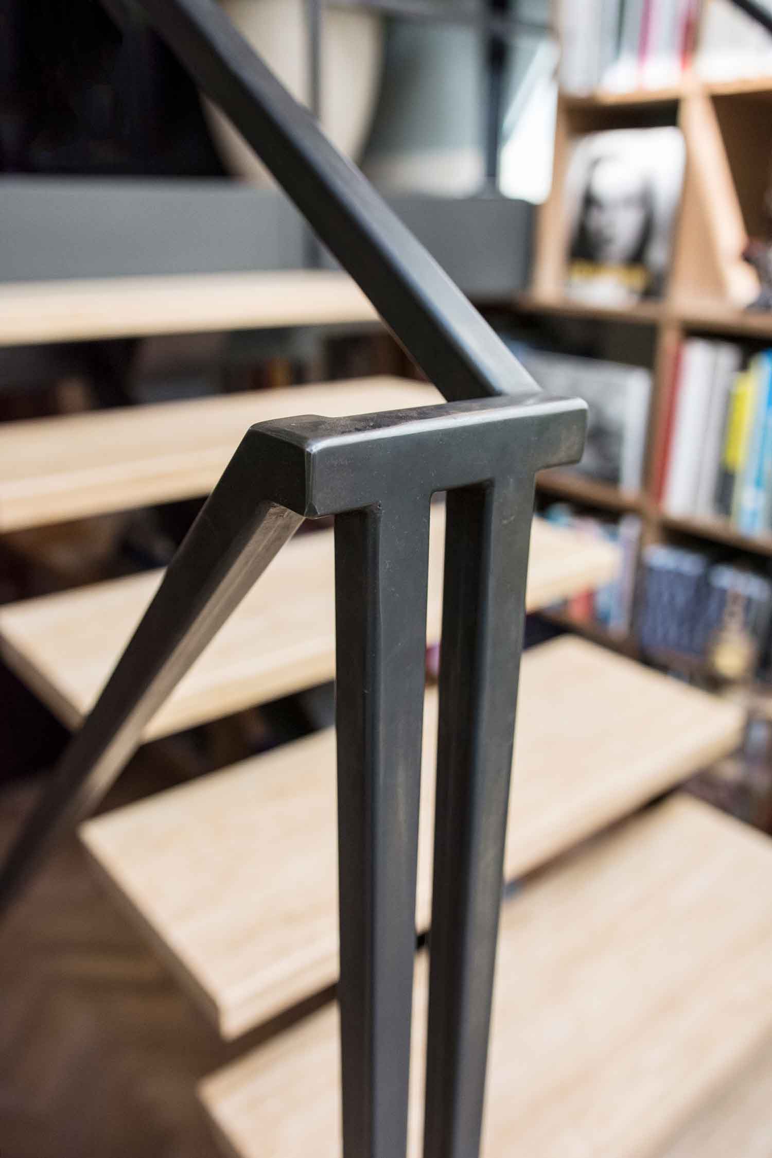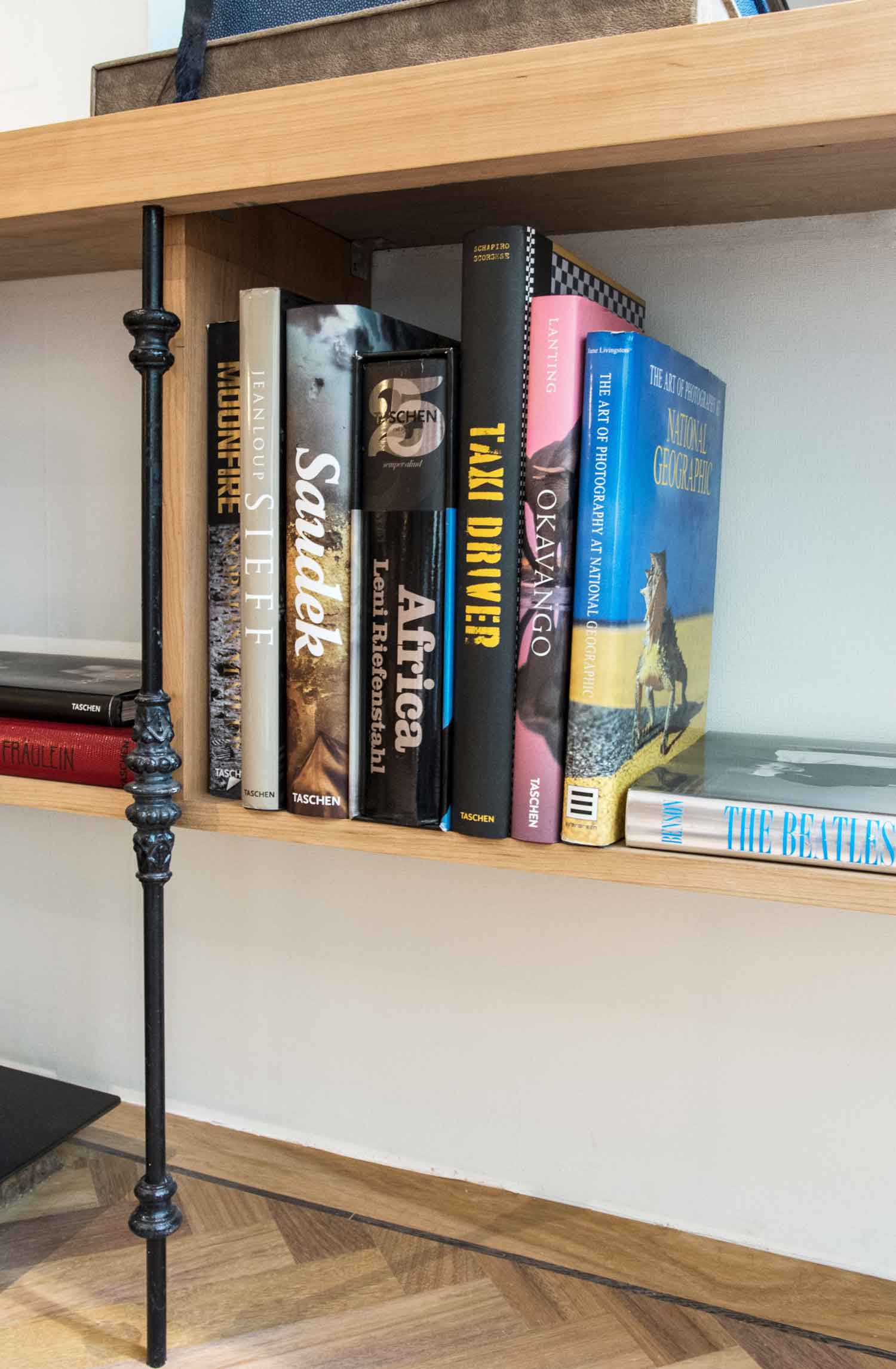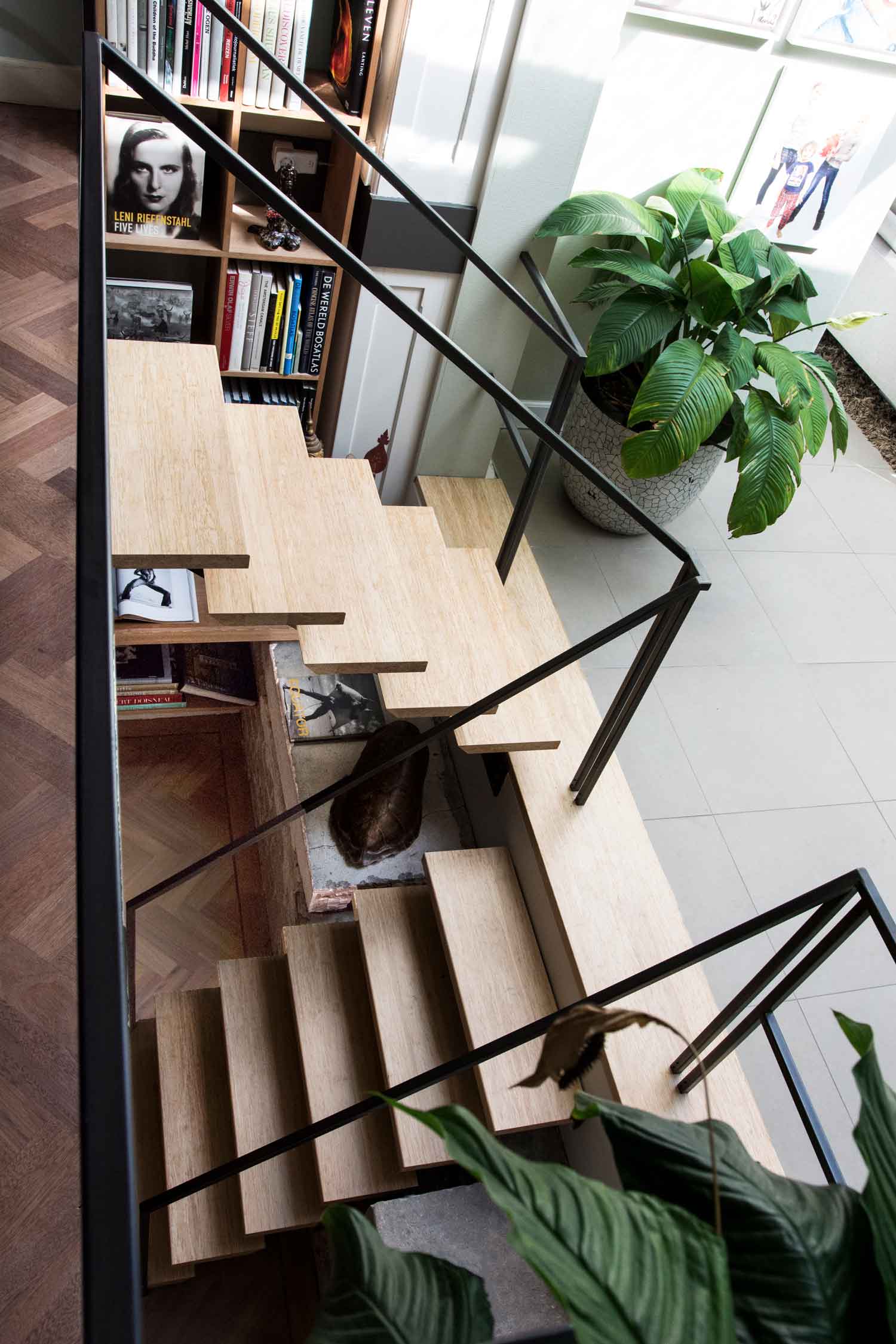 Een ongebruikte souterrain en een enorme hoeveelheid fotoboeken waren de aanzet tot deze uitdaging: een mini bibliotheek. Door de overgangen hard te materialiseren en tegelijkertijd de ‘ruimtes’ met een kast geleidelijk in elkaar te laten grijpen, ontstaat er een prettige spanning zo passend bij de visuele wereld van de fotografie.